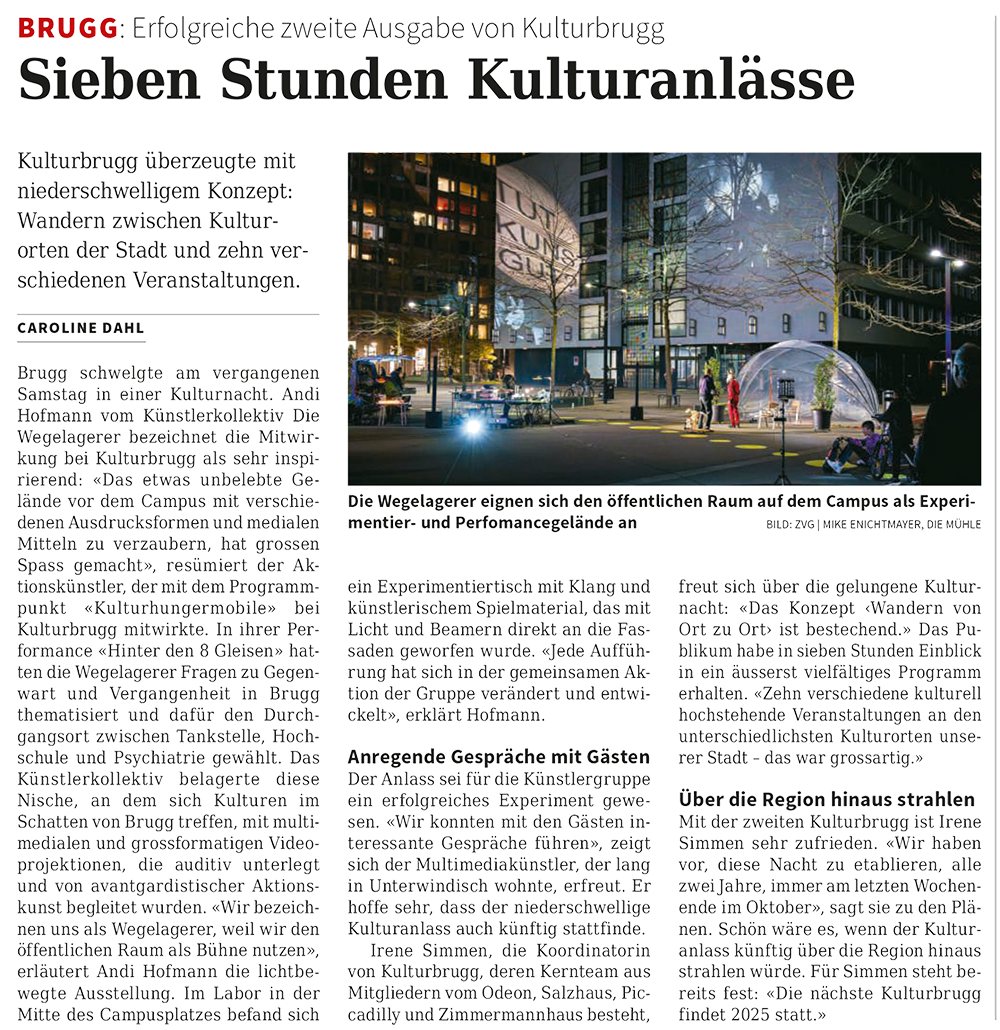 Das Kollektiv WEGWARTE mit der Aktion BLOWUP will dafür in Zukunft vermehrt öffentliche Räume wie Parks, Kreuzungen, Parkplätze und Einkaufszentren bespielen und reist, wann immer möglich, mit dem ÖV oder Velos an.