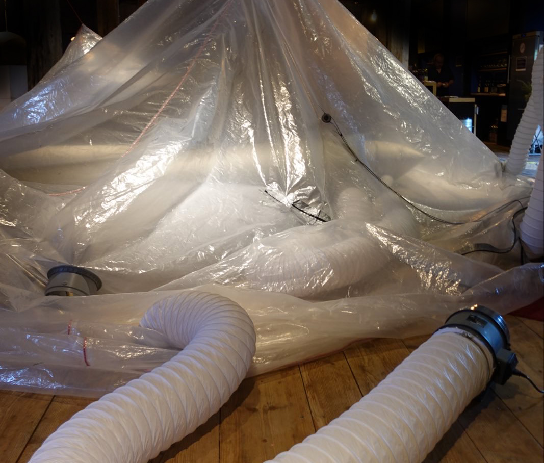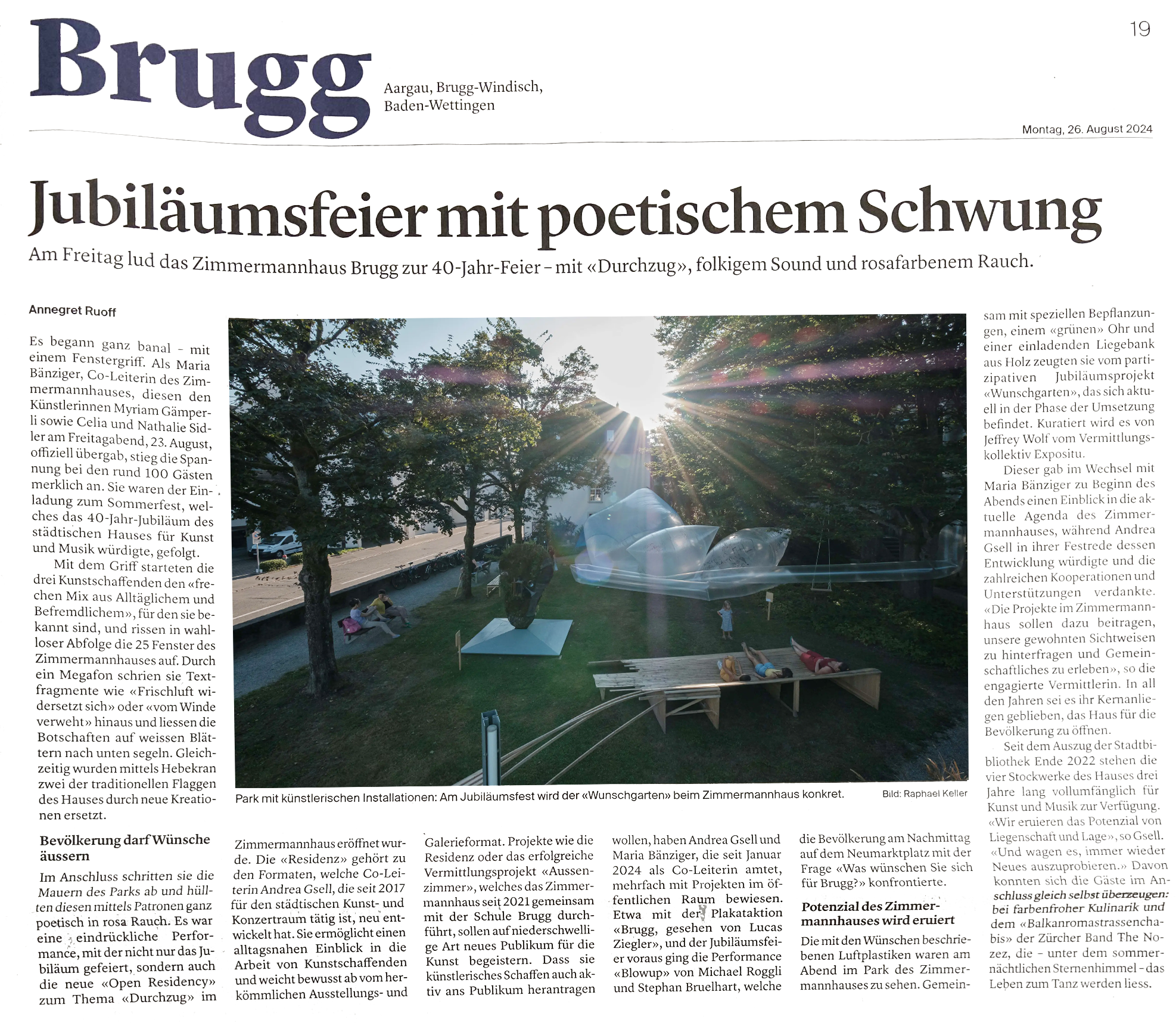 Um eine visuelle Brücke über die Aare zu der Galerie Zimmermannhaus und dem Wunschgarten zu schlagen wird BLOWUP, mobil, sichtbar an verschiedenen Orten der Stadt Brugg aktiv. Besucher*Innen des Bahnhofplatzes werden unerwartet mit merkwürdigen Experimenten konfrontiert, während die Personen, die wegen der zeitgenössischen Kunst in die Stadt kommen werden, auf diese Weise auch den Bahnhofplatz (oder andere Unorte von Brugg) kennenlernen. Die beiden Kategorien von Publikum vermischen sich. Die Infrastruktur von BLOWUP erlaubt ein Höchstmass an Flexibilität und spielt auch mit dem Momentum der Zeit. BLOWUP will Prozesse bewusst verlangsamen (beispielsweise durch die längere Dauer des Aufblasens oder durch das Publikum ausgelöste Interaktion wie INHALE EXHALE.